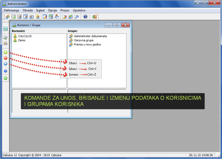 U ovom prozoru moguće je dodati, obrisati ili ažurirati podatke o korisniku ili grupi korisnika, zavisno od toga da li aktivirate levu ili desnu listu. Ove operacije možete izvesti komandama sa tastature Ctrl + U, Ctrl + I, Ctrl + Z, komandama iz kontekstnog menija (desni klik mišem) i klikom na opcije Ubaci, Izbaci ili Izmeni"