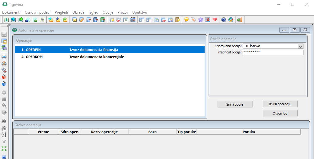Eventualne greške operacija se uvek beleže u posebnoj log datoteci grešaka svih operacija. Prikaz te log datoteke je omogućen u donjem panelu "Greške operacija".