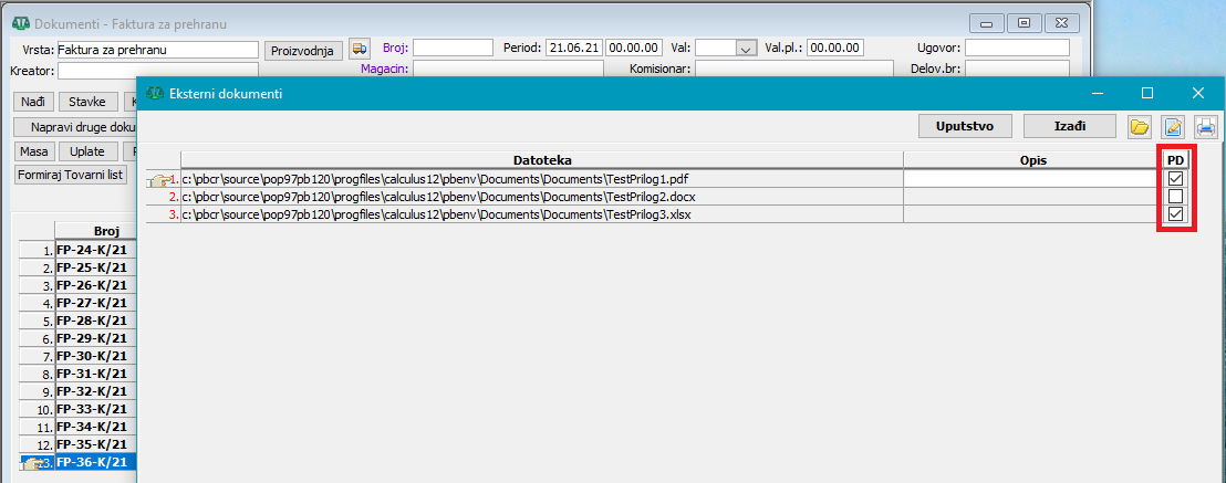 Otvaranjem ovog prozora i dodavanjem datoteke možete ručno da dodate bilo kakvu datoteku, bilo da je nastala iz Calculusa (npr. štampanjem u PDF bilo kakvog dokumenta ili izvozom u Excel i sl), bilo da potiče iz drugih izvora. Za datoteke koje želite da šaljete kao priloge, treba da uključite polje u koloni PD (Prilog dokumenta), a za datoteke koje prijavljujete u eksternim dokumentima iz drugih razloga i ne želite da ih šaljete kao priloge, isključite ovo polje.