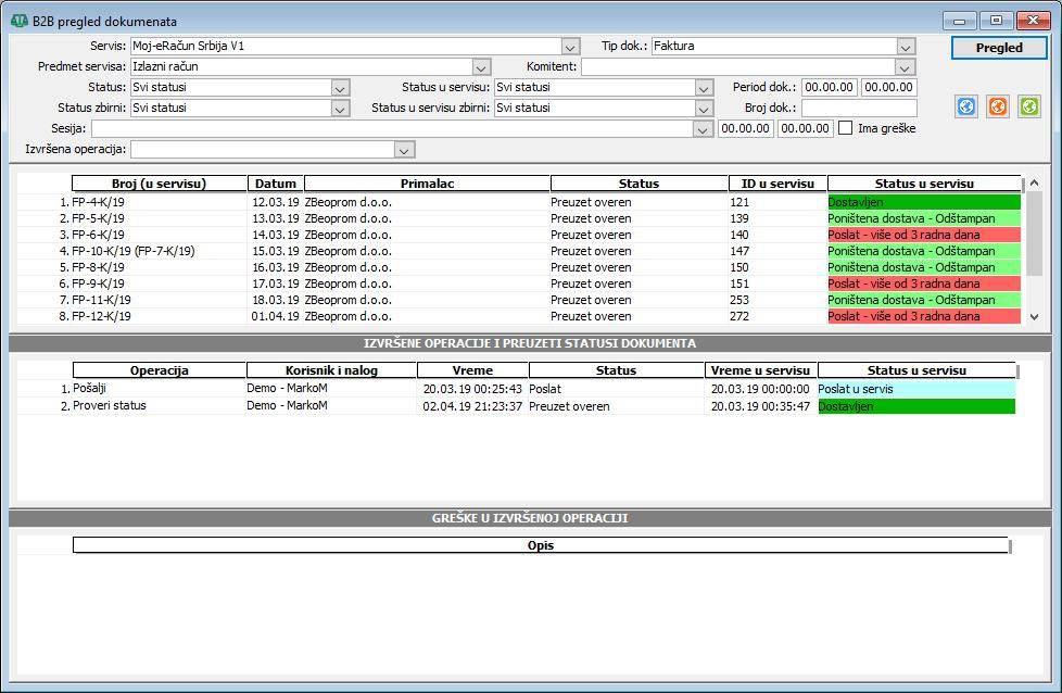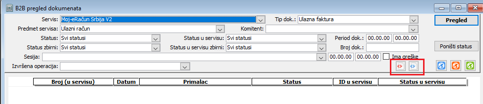 Izborom opcije menija "Dokumenti" --> "B2B pregled dokumenata" otvara se prozor za centralizovani pregled svih dokumenata nad kojima su već izvršene operacije servisa, (vidi sliku)