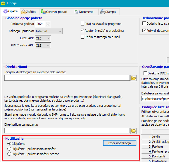 Sve notifikacije su podrazumevano isključene, pa ih korisnik uključuje u opcijama programa prema svojim potrebama, (vidi slike):