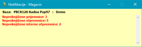 Trenutno je jedina notifikacija podrazumevano definisana u bazi (tzv. sistemske notifikacije) notifikacija za greške kod automatskih operacija. Sve ostale notifikacije (tzv. korisničke notifikacije) se definišu u bazi posebno za svakog korisnika prema njegovim zahtevima, jer svaka od njih obično zahteva proveru zavisnu od konkretnih podataka u bazi (npr. samo za određene vrste dokumenata, određene magacine i sl).