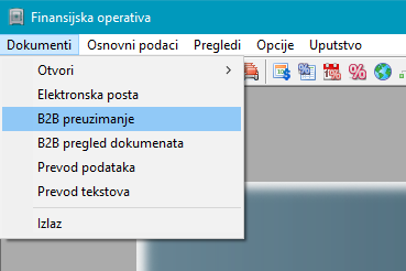 Preuzimanje dokumenata iz B2B servisa obavlja se u posebnom prozoru, koji se otvara opcijom menija "B2B preuzimanje" dostupnom u većini programa, vidi slike: