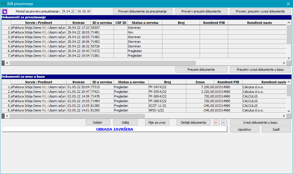 Posle operacije preuzimanja, u panelu "Dokumenti za uvoz u bazu" se prikazuju svi preuzeti dokumenti dostupni za uvoz u bazu, bez obzira na to kada su preuzeti (tekućom operacijom u prozoru ili ranije). Ako postoje odbijeni dokumenti koji su dostupni za preuzimanje (npr. odbijeni su preko portala samog servisa pre preuzimanja u Calculus), takvi dokumenti će biti preuzeti u formi datoteka, ali se neće prikazivati u spisku dokumenata za uvoz u bazu. U narednom periodu, kada bude omogućeno slanje i preuzimanje dodatnih dokumenata, neki od tih dokumenata neće ni biti predviđen uvoz u bazu (npr. izvodi otvorenih stavki, opomene i sl, koji sami po sebi ne predstavljaju dokument koji se evidentira u bazi). Ovakvi dokumenti će se samo preuzimati u formi datoteka, ali neće se prikazivati u panelu "Dokumenti za uvoz u bazu". Kao i svi drugi preuzeti dokumenti, tako se i ovi dokumenti mogu naknadno pregledati u prozoru "B2B pregled dokumenata".