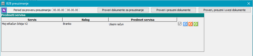 Na vrhu prozora nalazi se filter "Period za proveru preuzimanja" kojim se može podesiti period za proveru dokumenata za preuzimanje. Različiti servisi na različit način dostavljaju spiskove dokumenata za preuzimanje pa se i ovaj period tumači na različite načine. Detaljno objašnjenje pogledajte u uputstvu za konkretni servis.