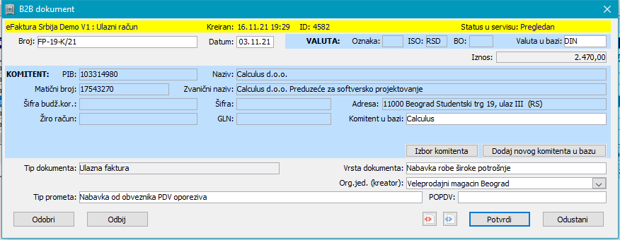 Kod preuzimanja dokumenata iz drugih programa uvek se javljaju određene poteškoće oko usklađivanja podataka. Opisaćemo ih na primeru preuzimanja i uvoza ulaznih faktura za servis Moj-eRačun. Da bi program uvezao preuzetu fakturu u bazu, mora odrediti set obaveznih podataka (broj dokumenta, datum, valutu, vrstu dokumenta, komitenta, organizacionu jedinicu i tip prometa). U panelu "Dokumenti za uvoz u bazu" je prikazano nekoliko osnovnih podataka, a detaljne podatke možete pogledati i dodatno podesiti u prozoru "B2B dokument" koji se otvara dvostrukim klikom miša na dokument u spisku ili dugmetom "Detalji dokumenta" za selektovani dokument u spisku, (vidi sliku)