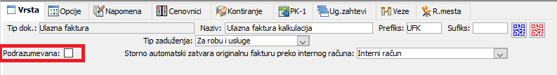 Polje "Podrazumevana".. Ako tip sadrži samo jednu vrstu dokumenta, nije potrebno podešavati podrazumevanu vrstu. Kod izlaznih i ulaznih faktura postoji dodatna specifičnost, jer se podrazumevana vrsta određuje posebno i za svaki "Tip zaduženja". U našem primeru ulaznih faktura, može se odrediti podrazumevana vrsta posebno za "obične" fakture i posebno za avansne račune.