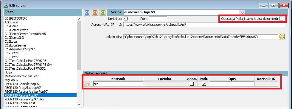 Uključivanjem polja za potvrdu "Operacija Pošalji samo kreira dokument" određuje se da operacija slanja dokumenata u servis samo kreira dokument na lokalnom disku (npr. XML ili PDF datoteku), ali ga ne šalje u servis.