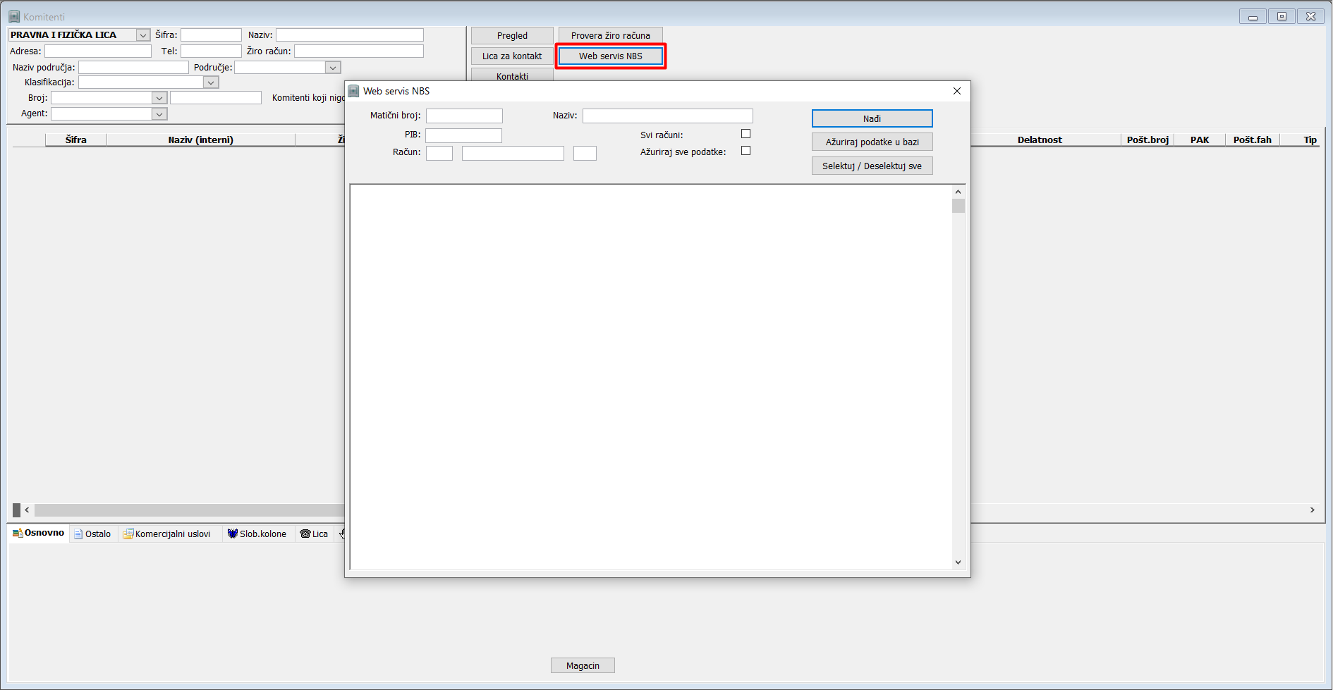 Zatvorite iskačući prozor "Web servis NBS" i kliknite na dugme "Pregled" kako biste osvežili podatke u bazi podataka i pronađite novo unetog komitenta, (vidi sliku)