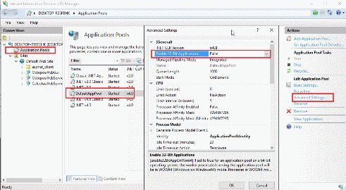 Problem sa konekcijom može praviti ODBC ako se po defaultu startuje 64-bitni. Ovo možemo podesiti u IIS menager-u tako što ćemo sa leve strane iznad našeg servisa kliknuti na Application Pools, izabrati DefaultAppPool i u Advanced Setings dozvoliti (Enable) 32-bitne Aplikacije. Podešavanja na slici ispod prikazana su u slučaju da koristite windows 10 i mogu se razlikovati u odnosu na operativni sistem.