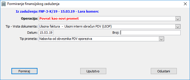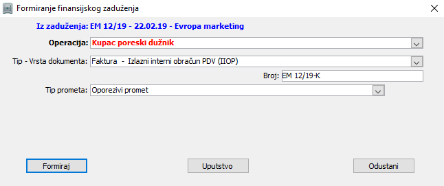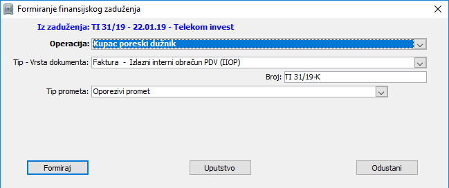 U polju "Operacija" prikazuju se operacije koje su dozvoljene za dokument od kojeg pravite novo zaduženje. U opštem slučaju prikazuje se samo operacija "Proizvoljni dokument", čime se kreira novo zaduženje bez neke posebne namene. Ovo možete koristiti kada želite da npr. kreirate izlaznu od ulazne fakture ili obrnuto, sa istim podacima (komitentom, iznosima itd).