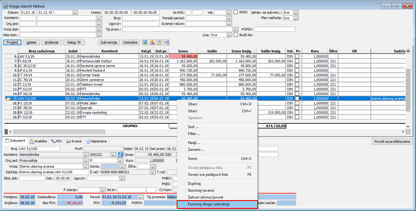 U finansijskoj operativi u knjigama ulaznih (KUF) i izlaznih faktura (KIF) formirate nova zaduženja (fakture) iz nekog već postojećeg zaduženja. Klikom desnog tastera miša na postojeće zaduženje, iz kontekstnog menija izaberite opciju "Formiraj drugo zaduženje" (vidi sliku)