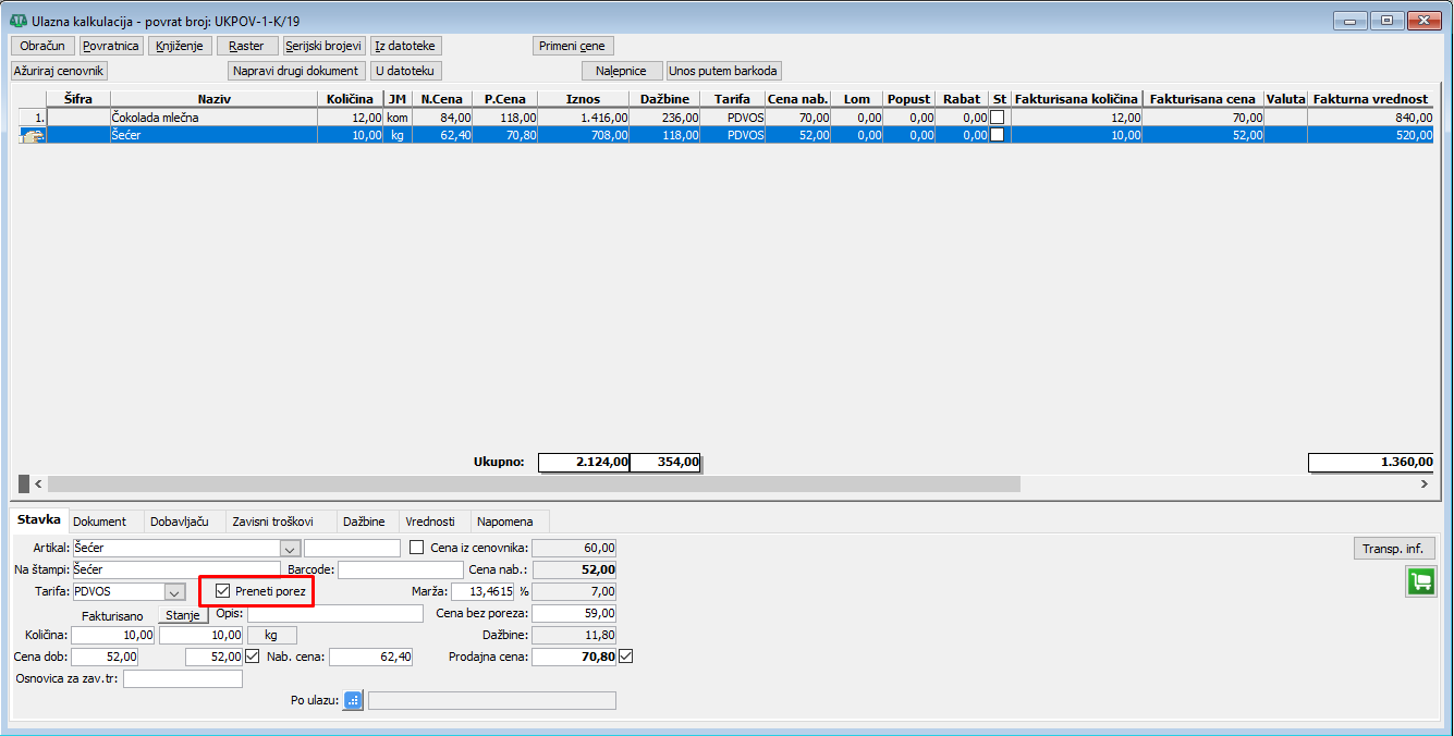 Kalkulacija normalno obračunava PDV na prodajnu cenu, u koju je uključena i marža. Ali kupac treba da pošalje fakturu dobavljaču sa iznosima identičnim onim koje dobije u njegovoj fakturi povrat, odnosno sa iznosima dobavljača. Kada se uključi opcija "Preneti porez", kalkulacija praralelno obračunava i PDV na nabavnu cenu (cenu dobavljača bez PDV umanjenu za rabat dobavljača). Time dobijamo sve elemente da iz kalkulacije odštampamo "Fakturu dobavljaču", za šta je obezbeđena i nova štampa u tom prozoru.