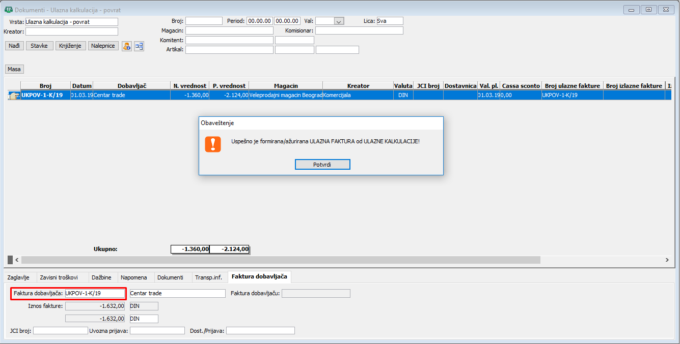 Kupac posle izrade ulazne kalkulacije povrat na opisani način treba samo da otvori karticu "Faktura dobavljača" u zaglavlju kalkulacije i dvostrukim klikom na polje "Faktura dobavljača" pokrene automatsko formiranje ulazne i izlazne fakture u finansijskoj operativi. Posle toga otvoriće se prozor sa ulaznom fakturom gde možete dopuniti ili izmeniti pojedine podatke (npr. broj ulazne fakture). U kartici "Faktura dobavljača" na kalkulaciji pojaviće se brojevi formirane ulazne fakture (Faktura dobavljača) i izlazne fakture (Faktura dobavljaču) (vidi sliku)