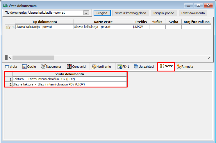 Ipak, ovim je obezbeđena samo štampa fakture dobavljaču, ali ne i njezino formiranje u knjizi izlaznih faktura. U kalkulacijama od ranije postoji mogućnost automatskog formiranja ulazne fakture. Sada je ta operacija dopunjena i kreiranjem izlazne fakture i to samo na kalkulacijama povrata. Da bi se ovo omogućilo, potrebno je na vrsti dokumenta za kalkulaciju povrat, u kartici "Veze", prijaviti vrstu dokumenta za ulaznu fakturu sa tipom zaduženja "Za knjiženje" i vrstu dokumenta za izlaznu fakturu sa tipom zaduženja "Interni obračun PDV" (vidi sliku)