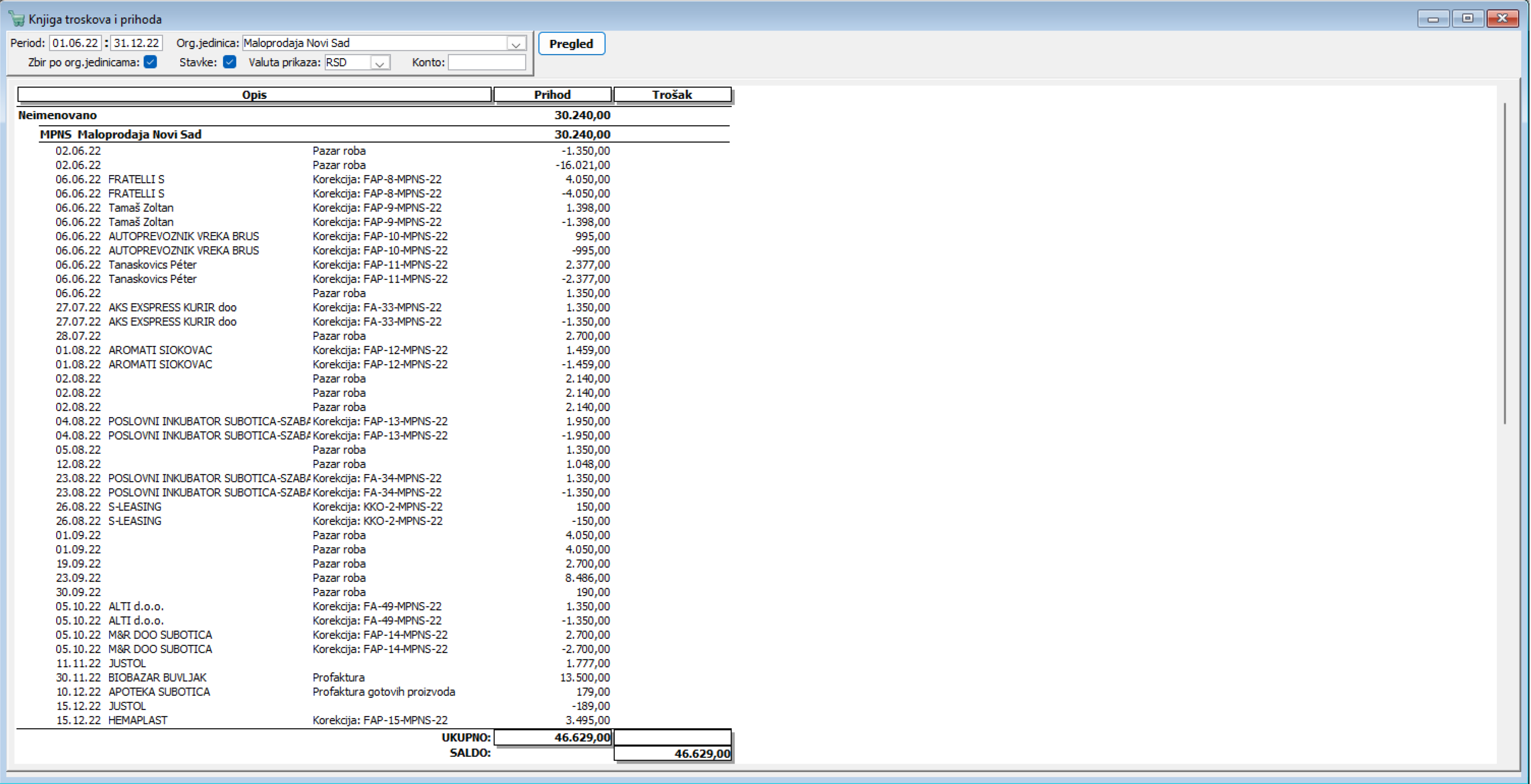 Pregled je dostupan za sve stavke svih izvoda i blagajni (naloga za uplatu i isplatu) koje pored ostalih podataka sadrže i konta glavne knjige.Ne navođenjem konta i organizacione jedinice pregled sadrži sve promene na tekućim računima i blagajnama koje sadrže konto glavne knjige. Navođenjem konkretnog konta i/ili organizacione jedinice dobija se pregled svi promena na tekućim računima i blagajnama za traženi konto glavne knjige.