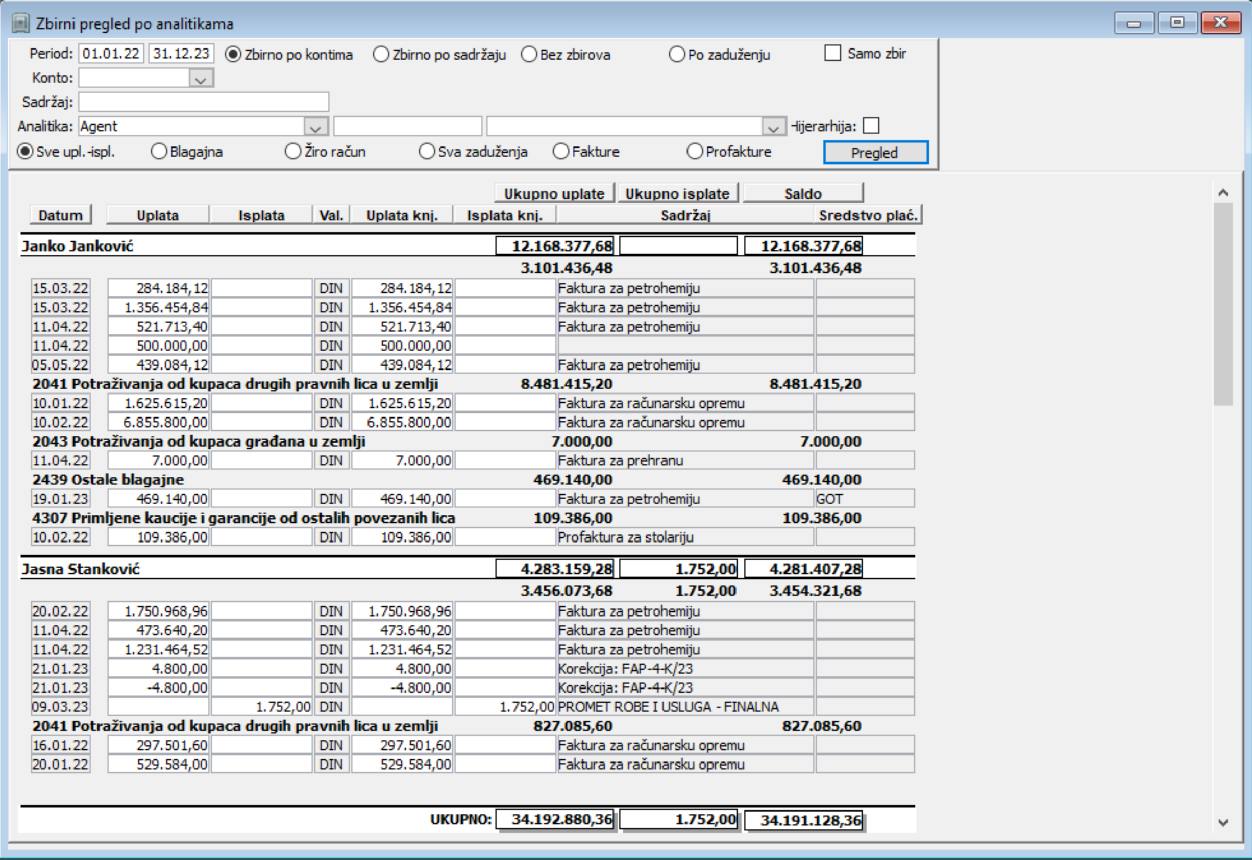 Do ovog pregleda se dolazi iz opcija glavnog menija programa "Finansijska operativa", na sledeći način Pregledi> Zbirni pregled po analitikama ili klikom na ikonu glavnog toolbar-a.