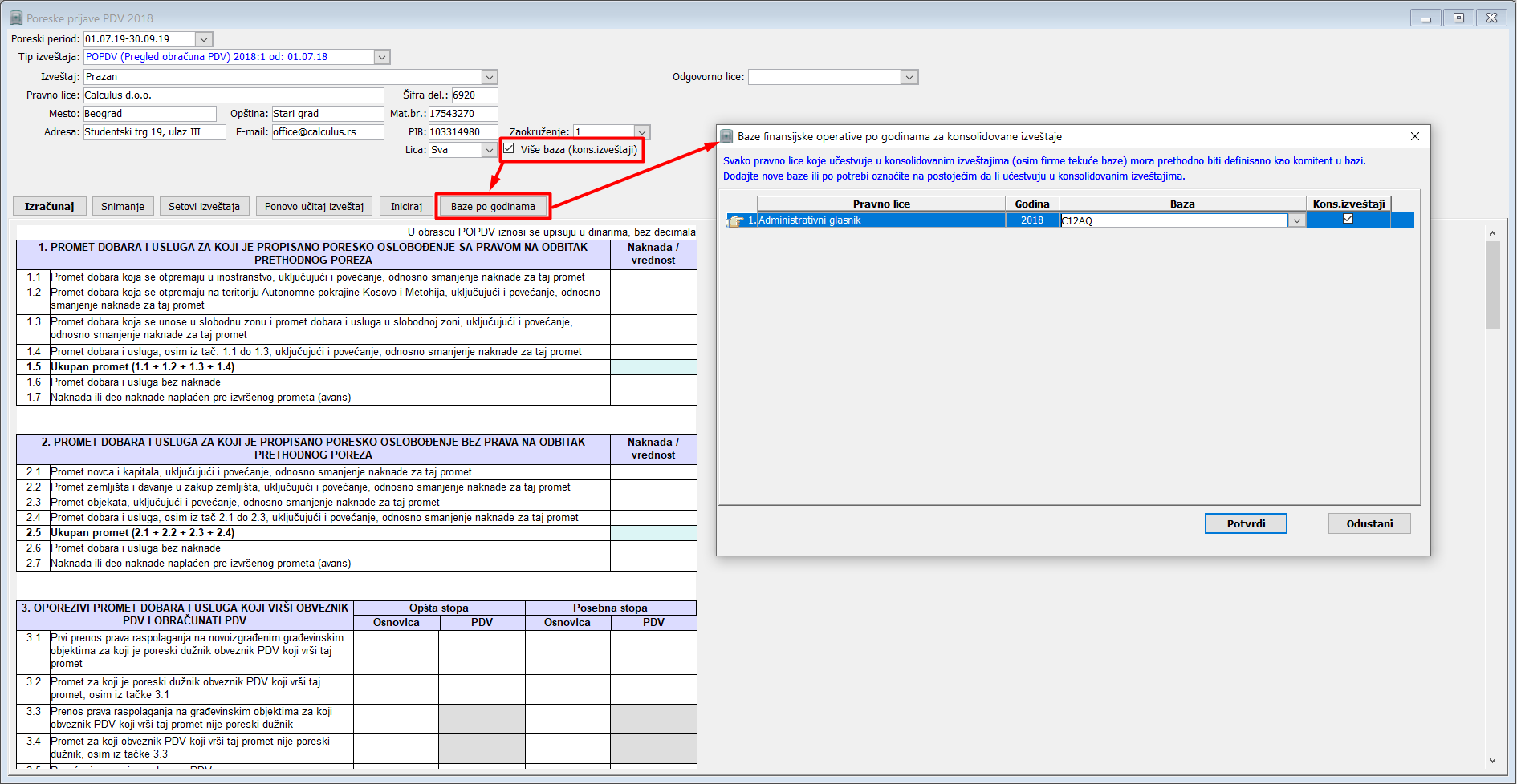 Opcija "Više baza (kons.izveštaji)", omogućava da se iz više baza formira jedan konsolidovani obrazac POPDV. Baze koje učestvuju u konsolidovanim izveštajima se prijavljuju dugmetom "Baze po godinama", analogno definisanju baza za konsolidovane bilanse u glavnoj knjizi. Obrazac PPPDV se formira iz obrasca POPDV, pa za njega opcija za više baza nije dostupna, jer je određena samim obrascem POPDV.