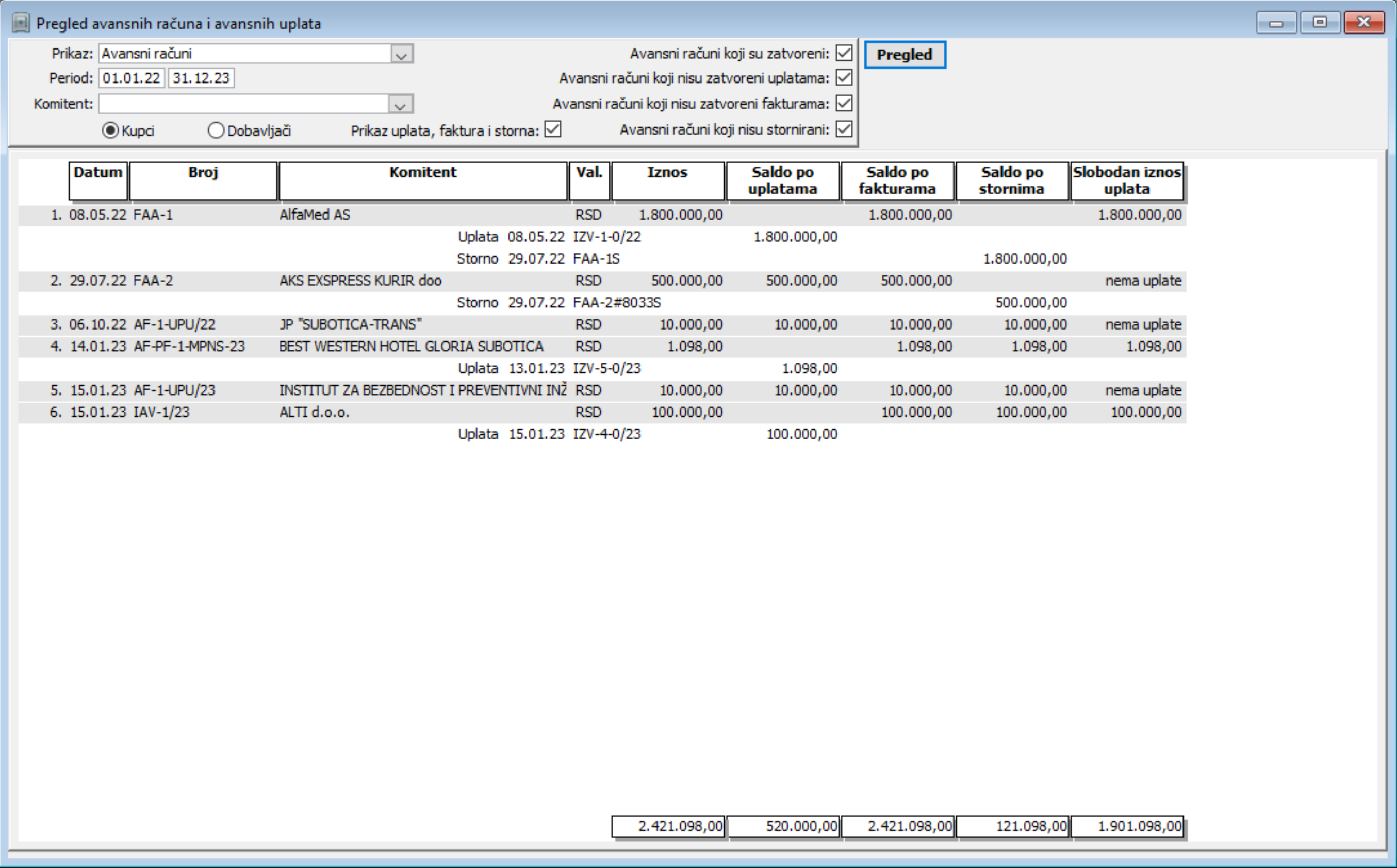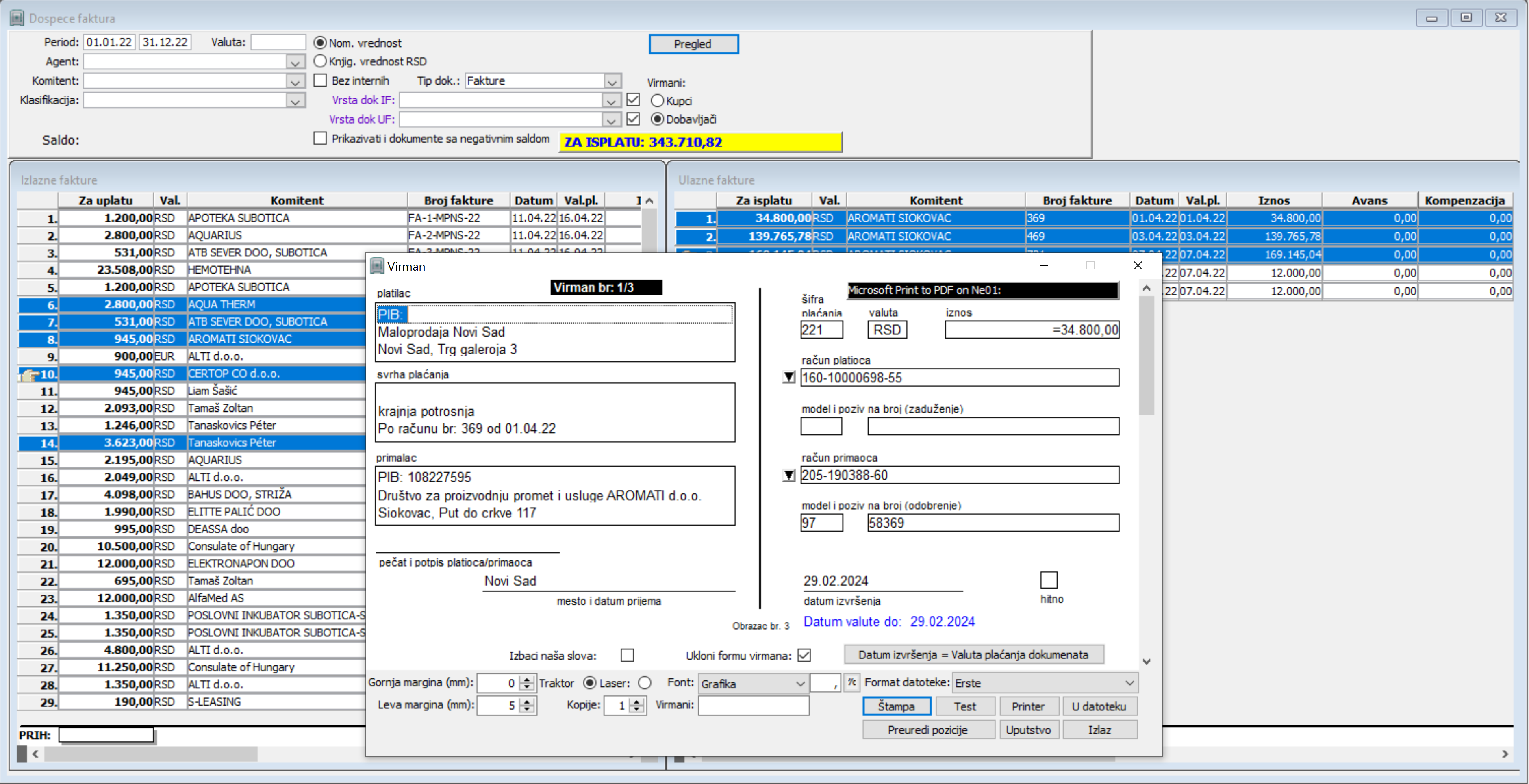 Omogućeno je vodenje kartica i zbirnih pregleda stanja kupaca i dobavljača, evidencija avansa. Zatvaranje zaduženja i uplata moguće je u različitim valutama. Takođe mogu se realizovati i delimična zatvaranja u zavisnosti od toga koliko je sredstava uplaćeno ili isplaćeno. Dospeće svih ulaznih i izlaznih faktura prikazano je kroz njihov pregled uz povezanost sa štampom virmana. Evidencija spornih potraživanja omogućava pravovremeni uvid kao i obračun kamata na sporna i zakasnela dugovanja i potraživanja. Knjige ulaznih i izlaznih faktura i profaktura mogu se evidentirati, pregledati i štampati bez potrebe njihovog ručnog evidentiranja u papirnom obliku.