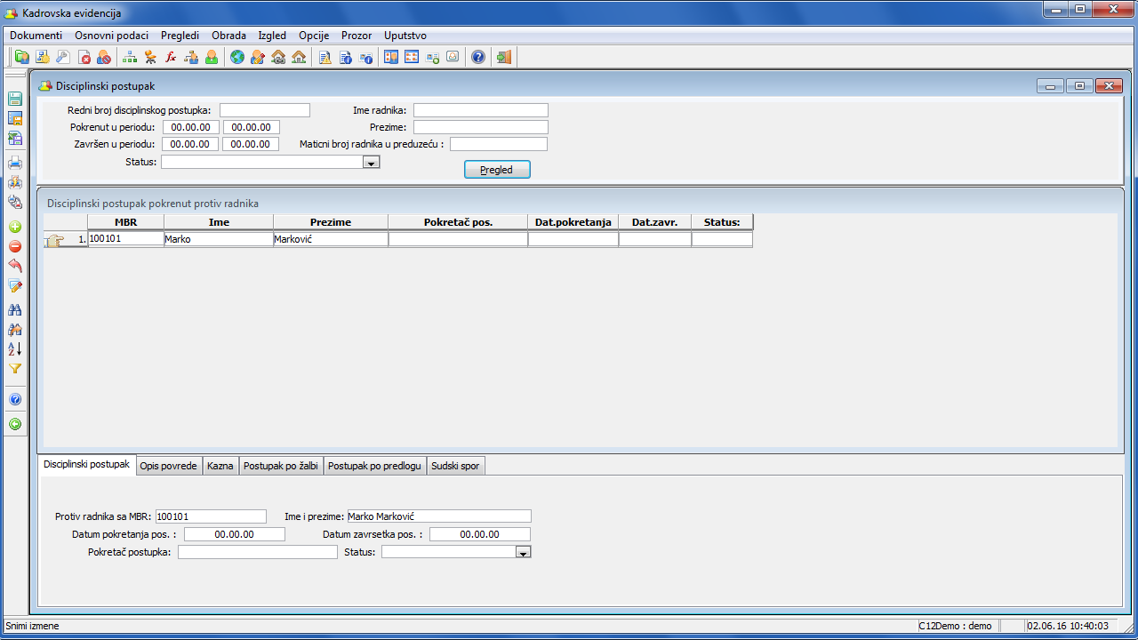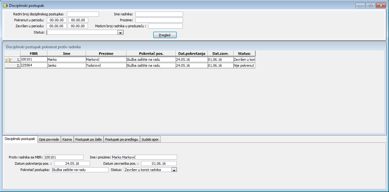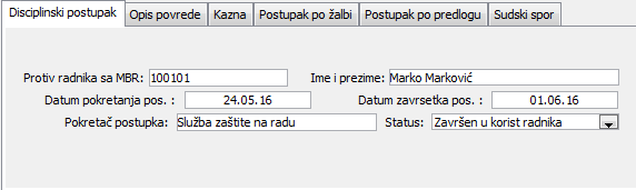 Listić "Disciplinski postupak" u koji se unose: matični broj radnika u polje "protiv radnika sa MBR:", ime i prezime radnika u polje "Ime i prezime:", datum pokretanja disciplinskog postupka u polje "Datum pokretanja pos.", datum završetka disciplinskog postupka u polje "Datum završetka pos.", ko pokreće disciplinski postupak u polje "Pokretač postupka:" i status predmeta izborom opcije iz padajuće liste u polju "Status:" ( vidi sliku )