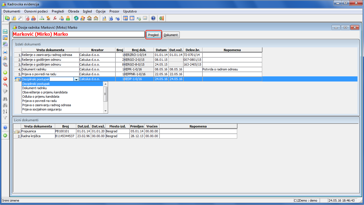Disciplinski postupak se pokreće unošenjem reda i izborom vrste dokumenta "Disciplinski postupak" u okviru dosijea radnika - podprozor "Izdati dokumenti" samo za izabranog radnika.