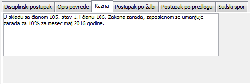 ,Listić "Kazna" opisno se unosi predložena/e disciplinske mere na osnovu Zakona, Pojedinačnog kolektivnog ugovora i Opšteg akta preduzeća ( vidi sliku )