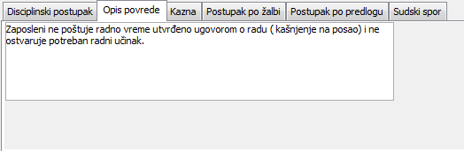 .Listić "Opis povrede" unosi se opisno vrsta i težina povrede radne discipline ( vidi sliku )