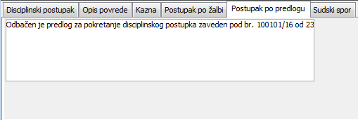 .Listić "Postupak po predlogu" opisno se unosi postupak koji je sproveden na osnovu predloga ovlašćenog lica za pokretanje disciplinskog postupka ( vidi sliku )