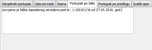 zaposlenog u preduzeću. Evidentira se i postupak po žalbi, odnosno prigovoru na odluku disciplinske komisije, udaljenje zaposlenog sa posla,
