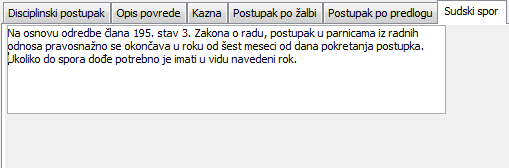 .Listić "Sudski spor" opisno se unosi postupak koji je sproveden na osnovu tužbe po pokrenutom disciplinskom postupku ( vidi sliku )