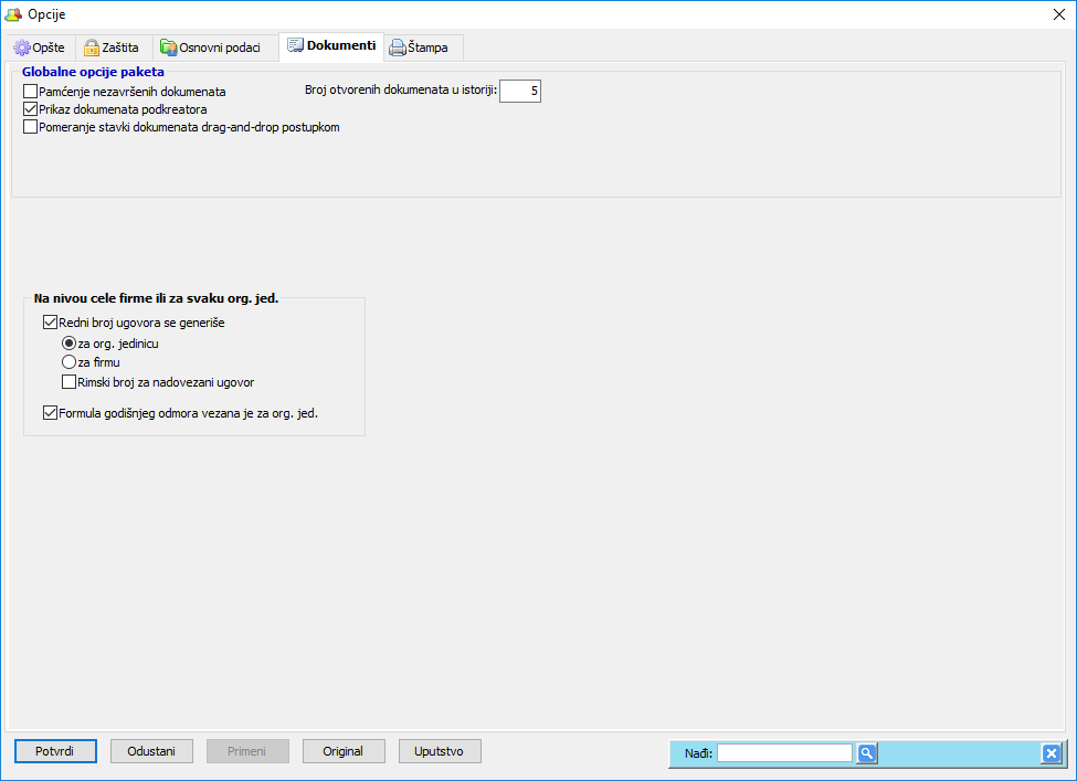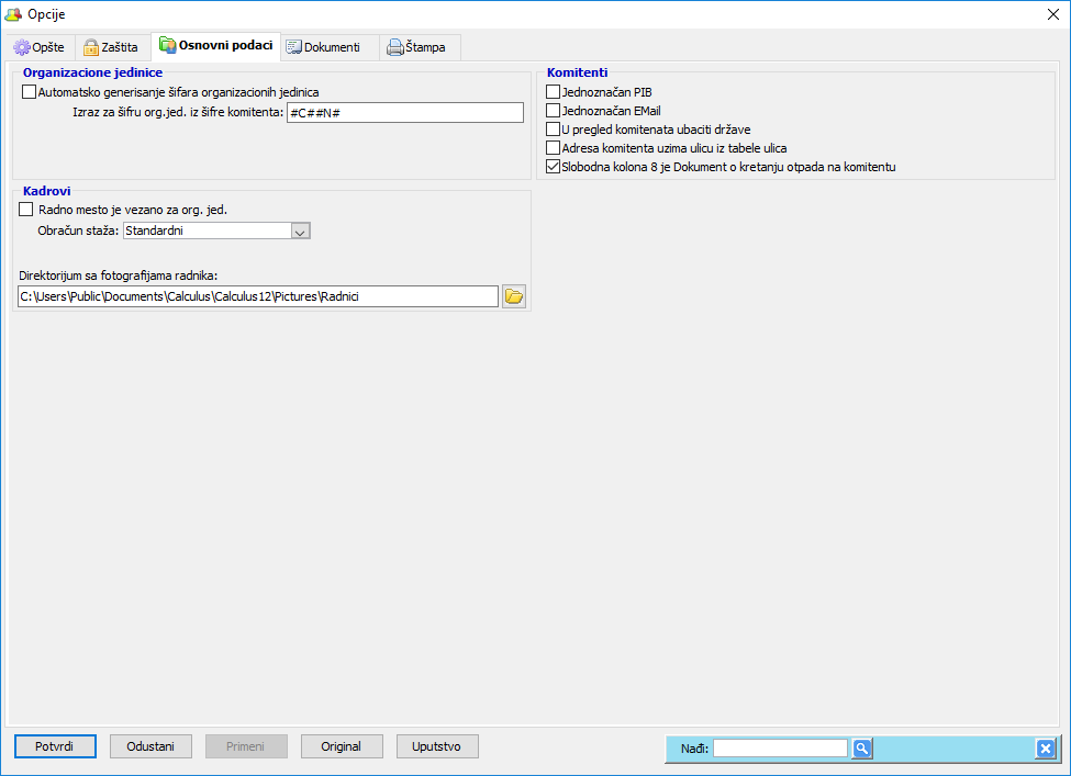za stalno, a dugmetom "Original" opcije se vraćaju na inicijalne vrednosti.