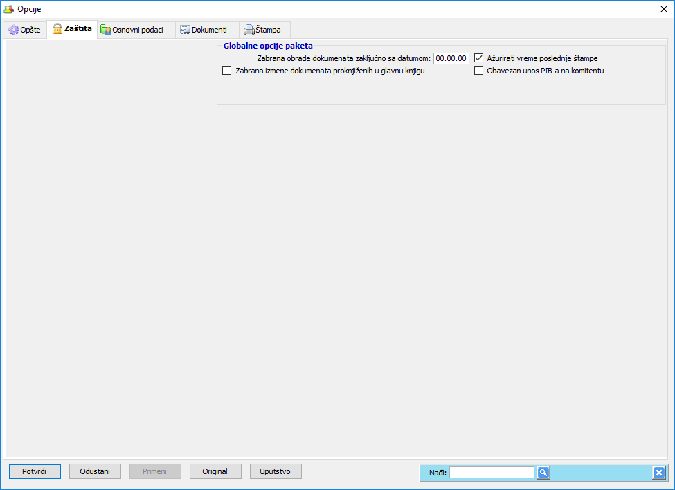 "Zabrana obrade dokumenata zaključno sa datumom:" - sva dokumenta sa datumom starijim ili istim kao i uneti datum nije moguće menjati, ažurirati odnosno ispravljati. Odgovorno lice koje se nalazi u grupi administratora dokumenata, može zabraniti izmenu dokumenata čiji je datum raniji ili jednak navedenom datumu. Ova zabrana odnosi se na dokumente u svim programima i uvodi se obično posle predavanja periodičnih i završnih računa;