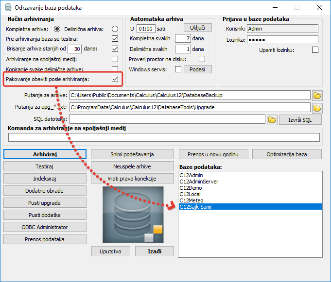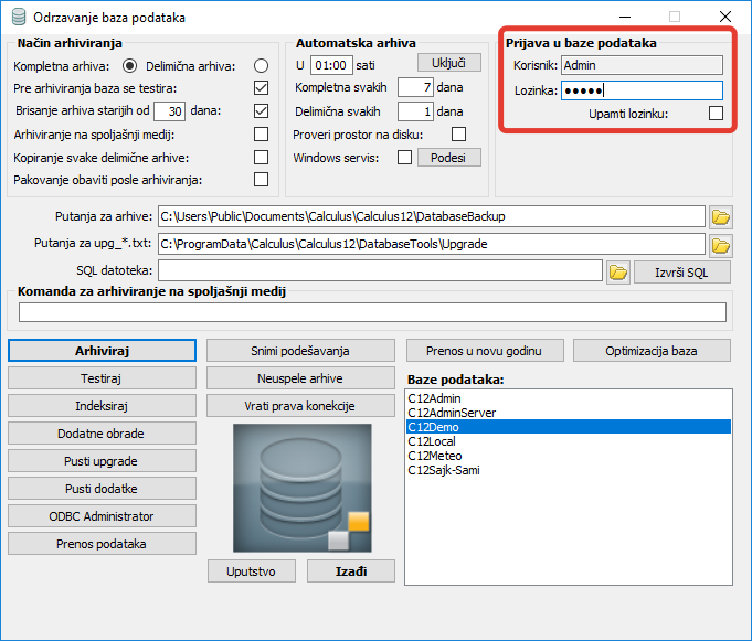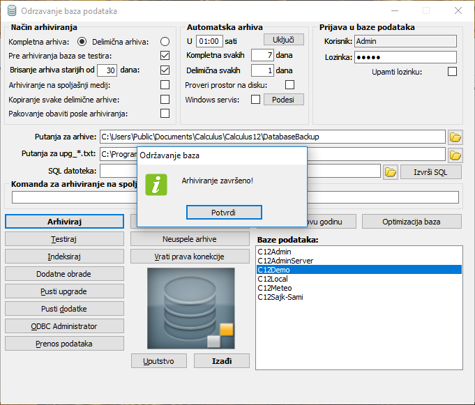 Direktorijum za arhiviranje upisuje se u polje "Putanja za arhive:" (C:\Users\Public\Documents\Calculus\Calculus12\DatabaseBackup). Kao što smo ranije rekli, ovo može biti putanja na drugom računaru odnosno rdnoj stanici ili barem drugom disku na serveru, ako je to moguće.