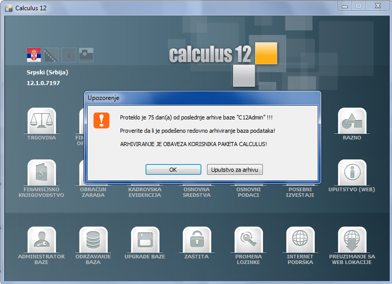 Ukoliko baza ne može da se arhivira odmah pozovite Calculus doo servisnu službu na telefon +381 (0)11 78 50 120.