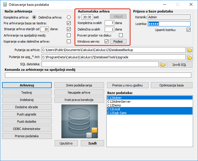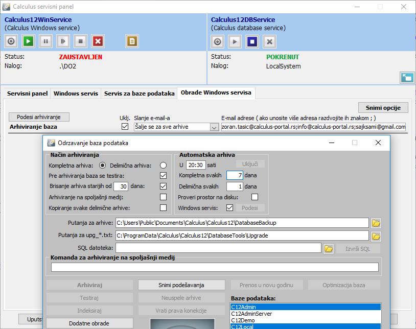 I pored mogućnosti da automatsko arhiviranje baze podataka u određeno vreme podesite direktno u programu "Održavanje baza", ipak automatsku arhivu podesite u Windows sevisu "Calculus Windows servis i servisni panel".