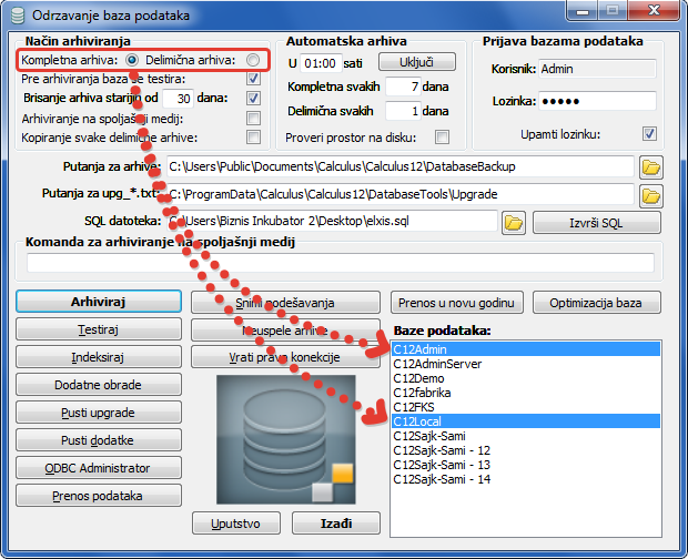 KOMPLETNA ARHIVA - arhiviraju se obe datoteke (glavna i log), što je dugotrajniji način, ali ovo je glavna arhiva i neophodno ju je redovno obavljati. U slučaju oštećenja baze dovoljno je vratiti ovu arhivu i baza je odmah raspoloživa za dalji rad.