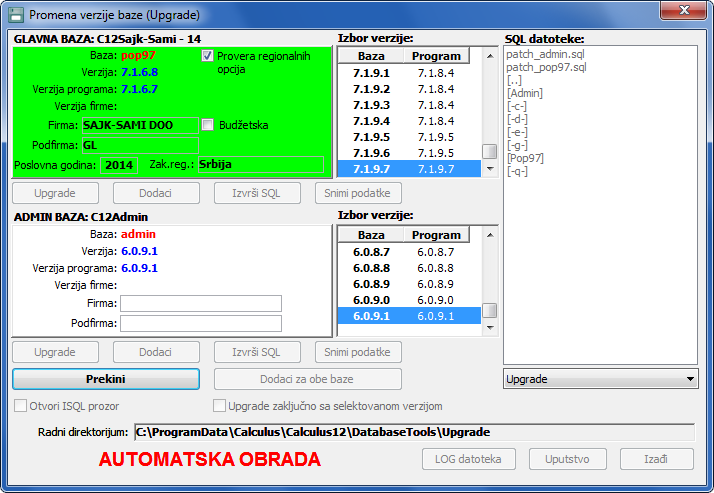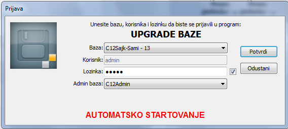 Prozor za automatsku prijavu bazi..Automatska obrada teče u prozoru "Upgrade baze" u kome možete pratiti promene varijanti (vidi sliku)