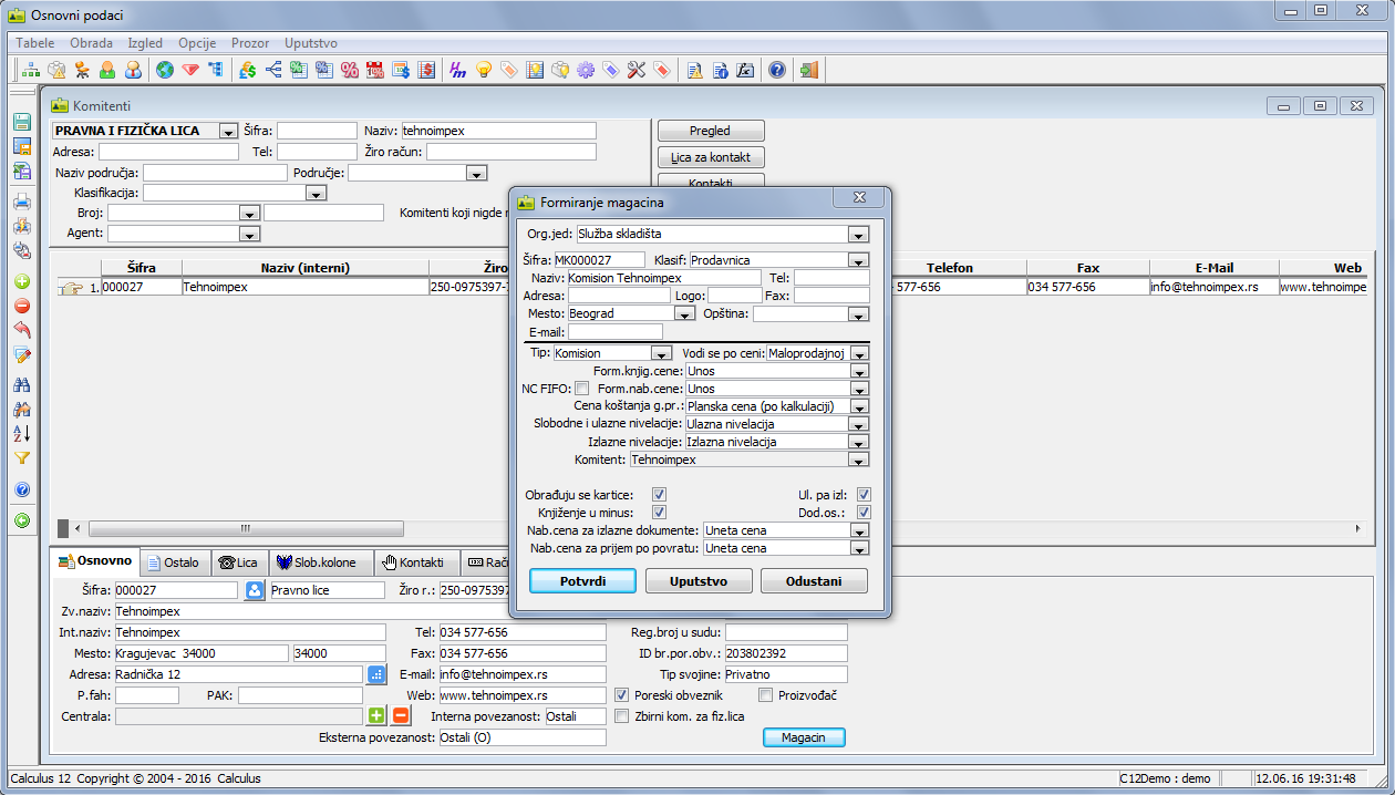 Sada u desnom delu prozora popunite sve potrebne podatke za novi magacin, (vidi sliku)