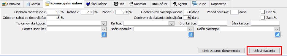 Komitenti - Listić "Komercijalni uslovi". kliknite na dugme "Uslovi plaćanja" kada je potrebno da uz komitenta definišete rabat, popust, lom i Cassa Sconto, (vidi sliku)