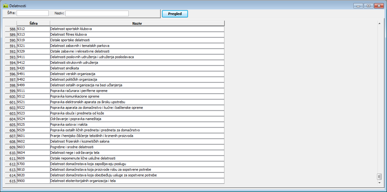 Prozor "Delatnosti" sadrži spisak šifara i opisa delatnosti u skladu sa uredbom o klasifikaciji delatnosti kao opšti standard.