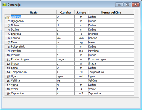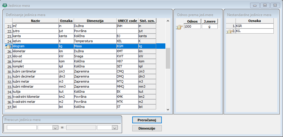 Prozor za unos, obradu i brisanje jedinica mera sadrži četiri podprozora i komandnu dugmad "Preračunaj" i "Dimenzije":