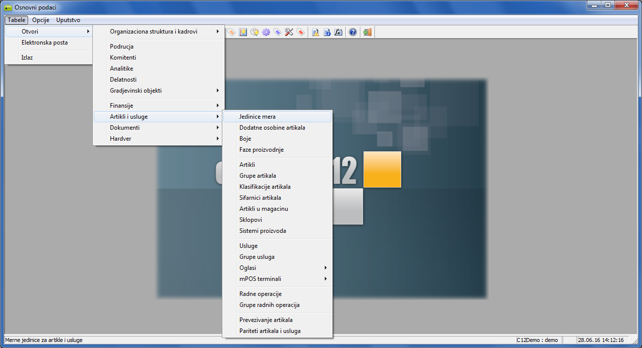 Do prozora "Jedinice mera" dolazi se iz opcija glavnog menija programa "Osnovni podaci", na sledeći način Tabele - Otvori - Artikli i usluge - Jedinice mera. U ostalim aplikacijama paketa klikom na opciju glavnog menija Osnovni podaci - Jedinice mera ( vidi sliku )