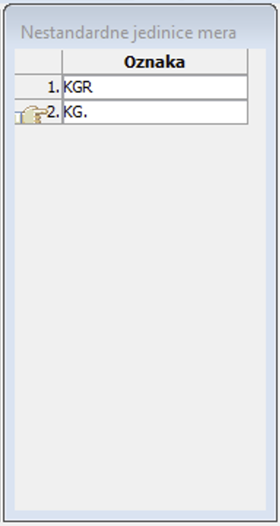 Podprozor "Definisanje jedinica mera" - predstavlja editor za definisanje i ažuriranje jedinica mera. U kolonu "Naziv" opisno se unosi pun naziv jedinice mere, u kolonu "Oznaka" unosi se standardna oznaka jedinice mere ali i oznaka jedinice mere koju ste sami definisali za neke interne potrebe, u kolonu "Dimenzija" unosite iz predefinisanog spiska dimenzija odgovarajuću dimenziju i u kolonu "UNECE code" unosite po potrebi internacionalnu oznaku jedinice mere za razmenu trgovačkih dokumenata, ( vidi sliku )
