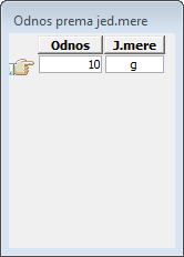 . Kolona "Sist.ozn." se ne popunjava i sadrži sistemsku oznaku jedinice mere.Podprozor "Odnos prema jed. mere" - za selektovanu jedinicu mere definišete njen odnos prema nekoj od odgovarajućih jedinica mera (kilometar u metre itd.). Ubacite novi red i u kolonu "Odnos" unosite odnos selektovane jedinicu mere i jedinice mere koju navodite u koloni "J.mere" ( vidi sliku )