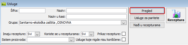 . Opcija "Imaju recepturu:" postavlja kriterijum za prikaz samo onih usluga koje imaju recepturu. Opcija "Prikaz recepture:" otvara podprozor u kojem se prikazuje receptura izabrane usluge. Pregled usluga po postavljenim kriterujimima filtera inicira se klikom na dugme "Pregled" ( vidi sliku )