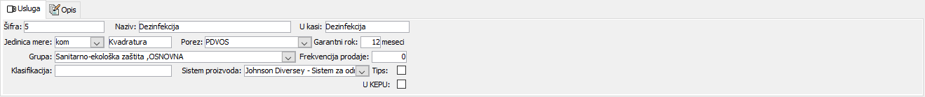 Listić "Usluga" - obuhvata unos sledećih podataka: šifre usluge, naziva usluge, jedinice mere po kojoj će se usluga izvršiti, porez koji se obračunava na cenu usluge, garantni rok koji važi za određenu uslugu, grupa kojoj usluga pripada i pripadnost sistemu proizvoda (vidi sliku)