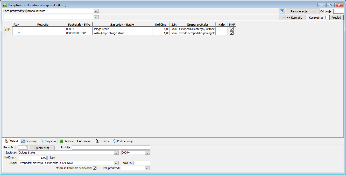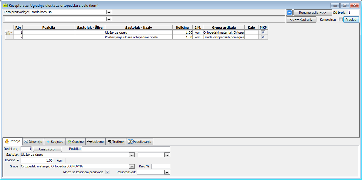 U listić "Pozicija" unose se sledeći podaci: redni broj, sastojak koji ulazi u ovu uslugu, količina tog sastojka i jedinica mere ( koja se automatski vuče iz definicije određenog sastojka ) i grupe kojoj taj sastojak pripada. Listić "Troškovi" služi za unos polja koja će dati informacije o broju radnih časova koji su potrebni za izvršenje usluge o kojoj je reč, cena radnog časa kao i način zaokruženja cene koštanja (da li se nasleđuje iz grupe, da li se zaokruživanje vrši na veću ili manju cifru i sl. ). Za više podataka o načinu formiranja receptura pročitajte u delu uputstva Recepture.