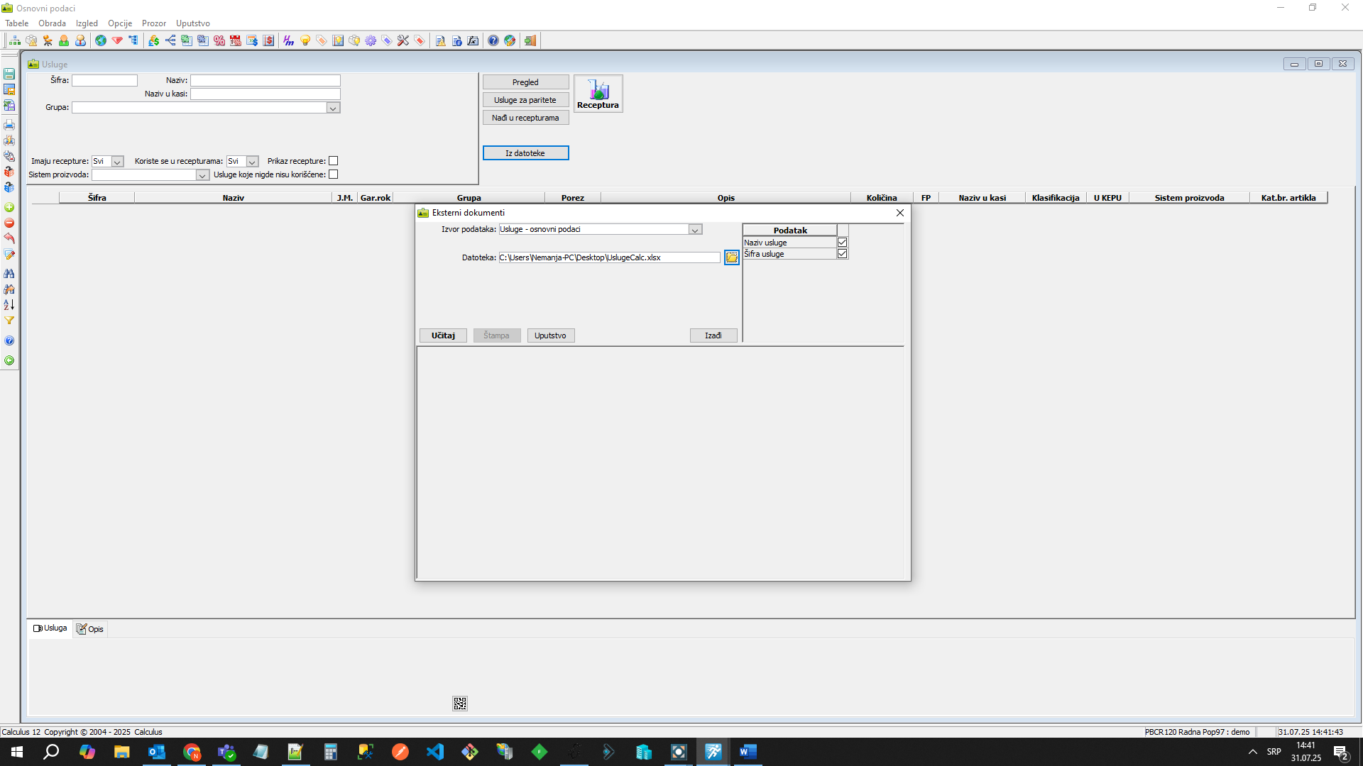 Tip dokumenta u koji se pohranjuju podaci je .xlsx. Sam naziv dokumenta sa podacima nije bitan. U istom mora postojati sheet koji ima naziv "Usluge Calculus" za import podataka usluga.