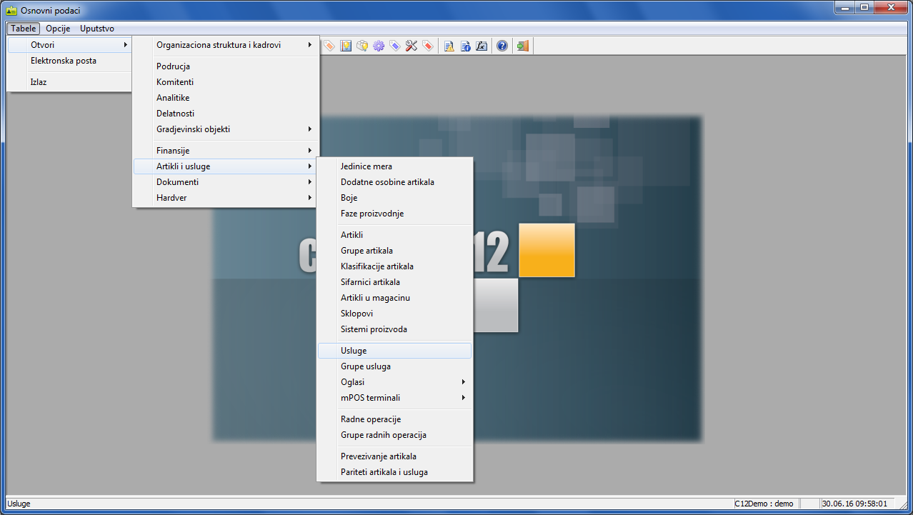 U glavnom meniju programa "Osnovni podaci" odaberite stavku "Tabele - Otvori - Artikli i usluge - Usluge" ( vidi sliku )