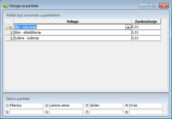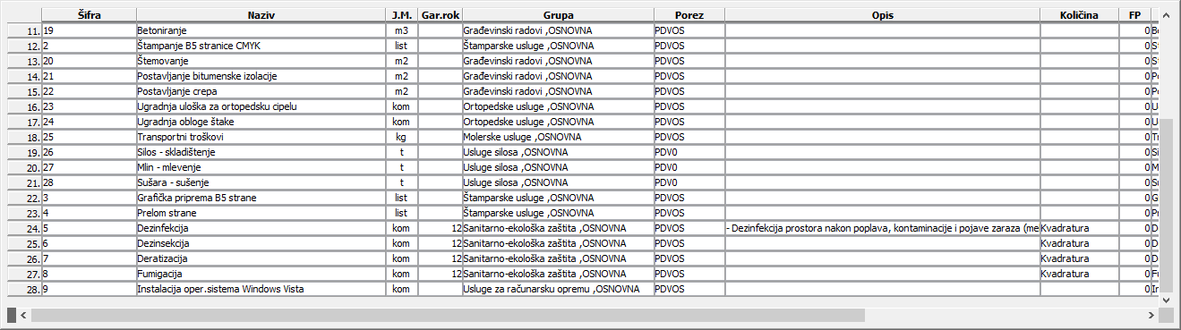 Lista sa pregledom usluga zauzima središnju oblast prozora "Usluge". Sadrži pregled podataka unetih usluga koje zadovoljavaju zadati kriterijum pretrage, ili ukoliko kriterijum nije naveden pregled svih unetih usluga. Ovde je omogućeno unošenje novog, brisanje i obrada već postojećeg zapisa sa podacima o usluzi (vidi sliku)